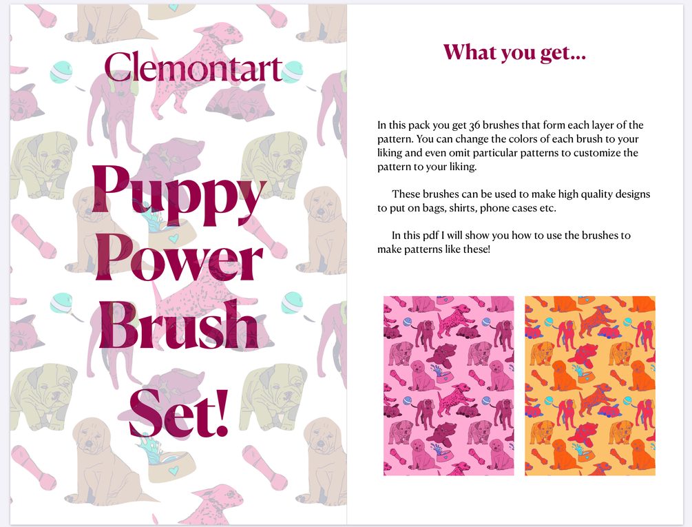 This one is my favorite pattern brush project so far! You can create your own custom pup pattern. Mix and match brushes to get your desired look and layer colors for a unique design! A free instructional pdf with my favorite pattern brush tips and tricks included.